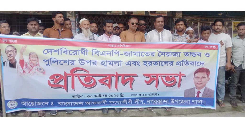 নগরকান্দায় বিএনপির দেশব্যাপি নৈরাজ্যের প্রতিবাদে মৎস্যজীবি লীগের প্রতিবাদ সমাবেশ